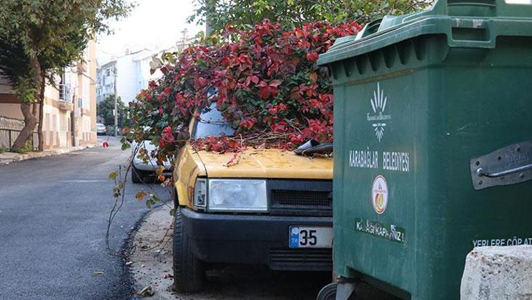 İzmir’in Karabağlar ilçesinde, sahibi 8 yıl önce vefat eden ve zamanla sarmaşıklarla kaplanan park halindeki otomobil, çekiciyle kaldırıldı.