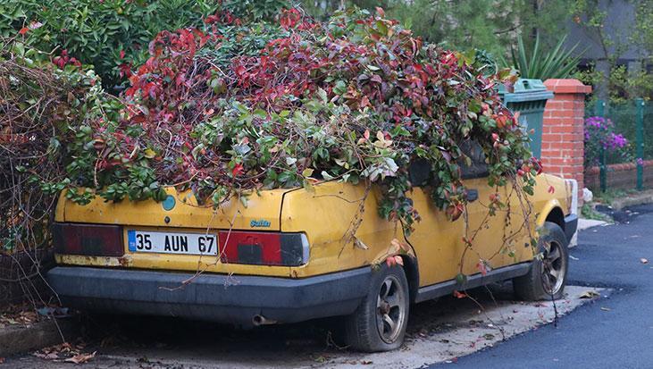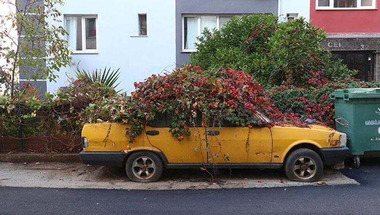Üçkuyular Mahallesi’nde ikamet eden Mustafa Artun, “Yaklaşık 3 yıldır burada yaşıyorum. Otomobilin üzerindeki sarmaşıklar daha kısaydı. Lastikleri de biraz şişikti ama son hali bu. Kaderini bekliyor.” dedi.