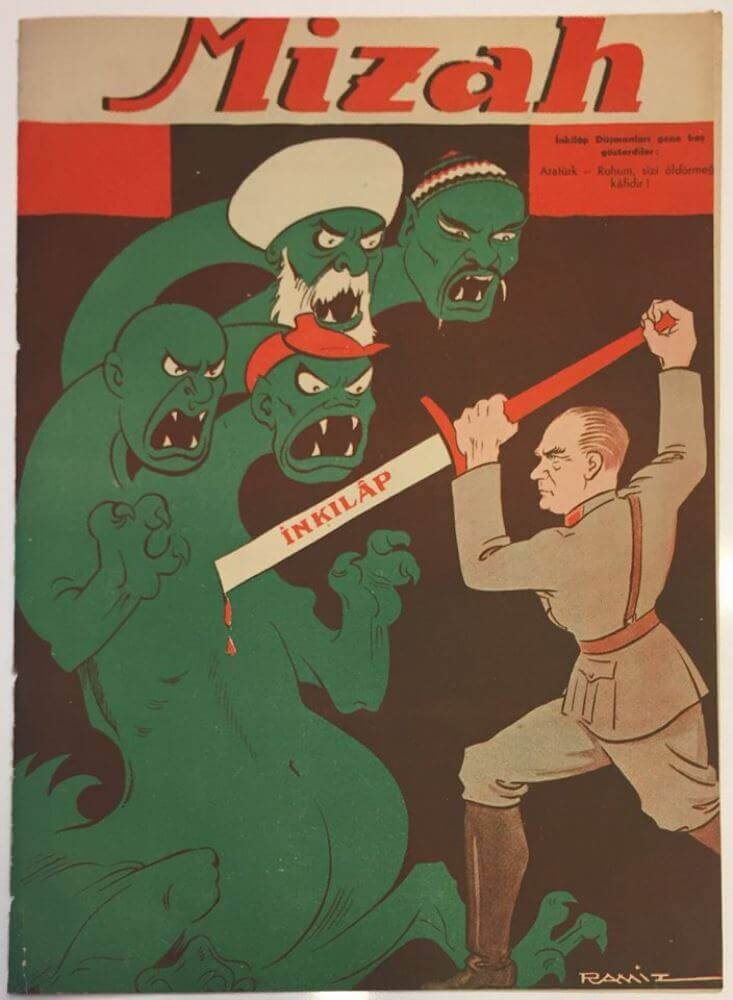 Söz konusu heykelin, 1947’de yayımlanan Mizah dergisindeki bir çizimden esinlenerek hazırlandığı belirtiliyor. Çizimde Atatürk’ün, gericiliği simgeleyen dört başlı yeşil canavarı “İnkılap” kılıcıyla alt ettiği bir sahne yer alıyordu.