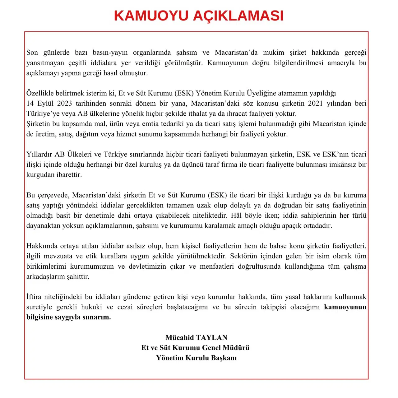 Bu çerçevede, Macaristan’daki şirketin Et ve Süt Kurumu (ESK) ile ticari bir ilişki kurduğu ya da bu kuruma satış yaptığı yönündeki iddialar gerçeklikten tamamen uzak olup dolaylı ya da doğrudan bir satış faaliyetinin olmadığı basit bir denetimle dahi otaya çıkabilecek niteliktedir. Hâl böyle iken; iddia sahiplerinin her türlü dayanaktan yoksun açıklamalarının, şahsımı ve kurumumu karalamak amaçlı olduğu apaçık ortadadır.