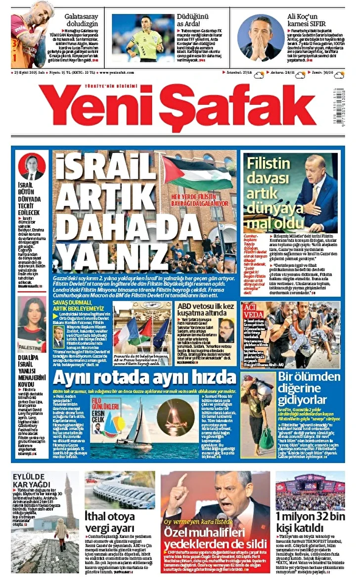 Yeni Şafak Gazetesi’nin 23 Eylül 2025 tarihli birinci sayfasında yer alan manşet ve haberler…
