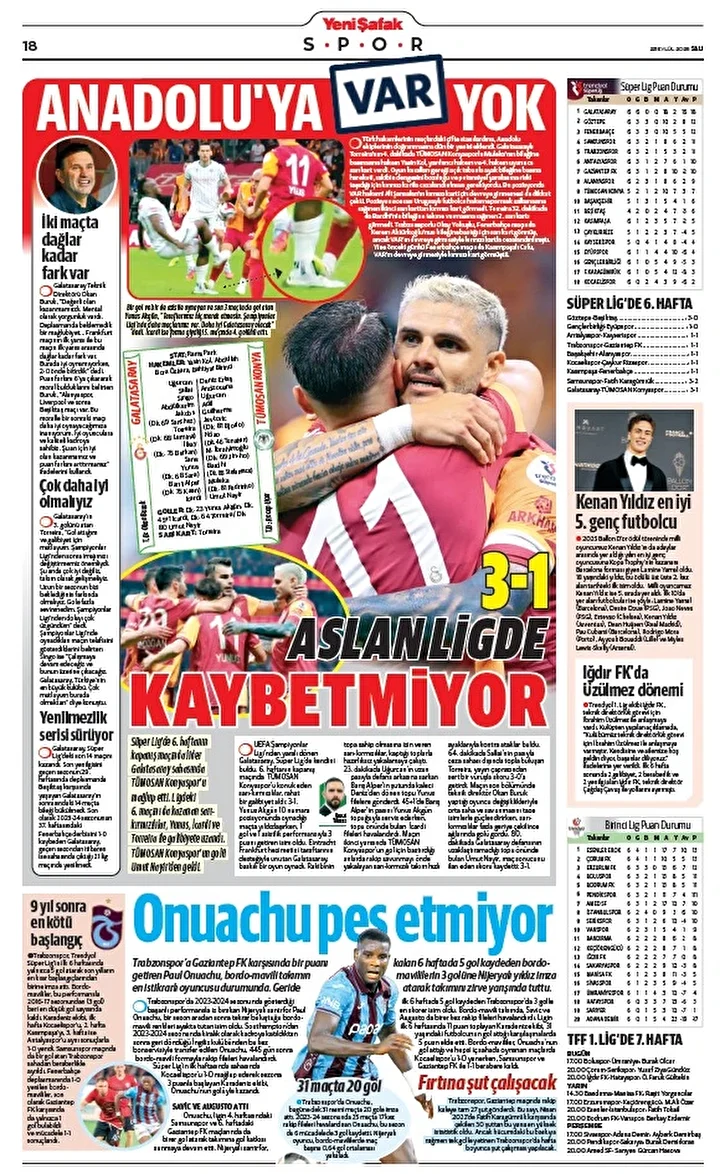Süper Lig’de 6. haftanın kapanış maçında lider Galatasaray sahasında TÜMOSAN Konyaspor’u mağlup etti. Ligdeki 6. maçını da kazanan sarıkırmızılılar, Yunus, İcardi ve Torreira ile galibiyete uzandı. TÜMOSAN Konyaspor’un golü Umut Nayir’den geldi.