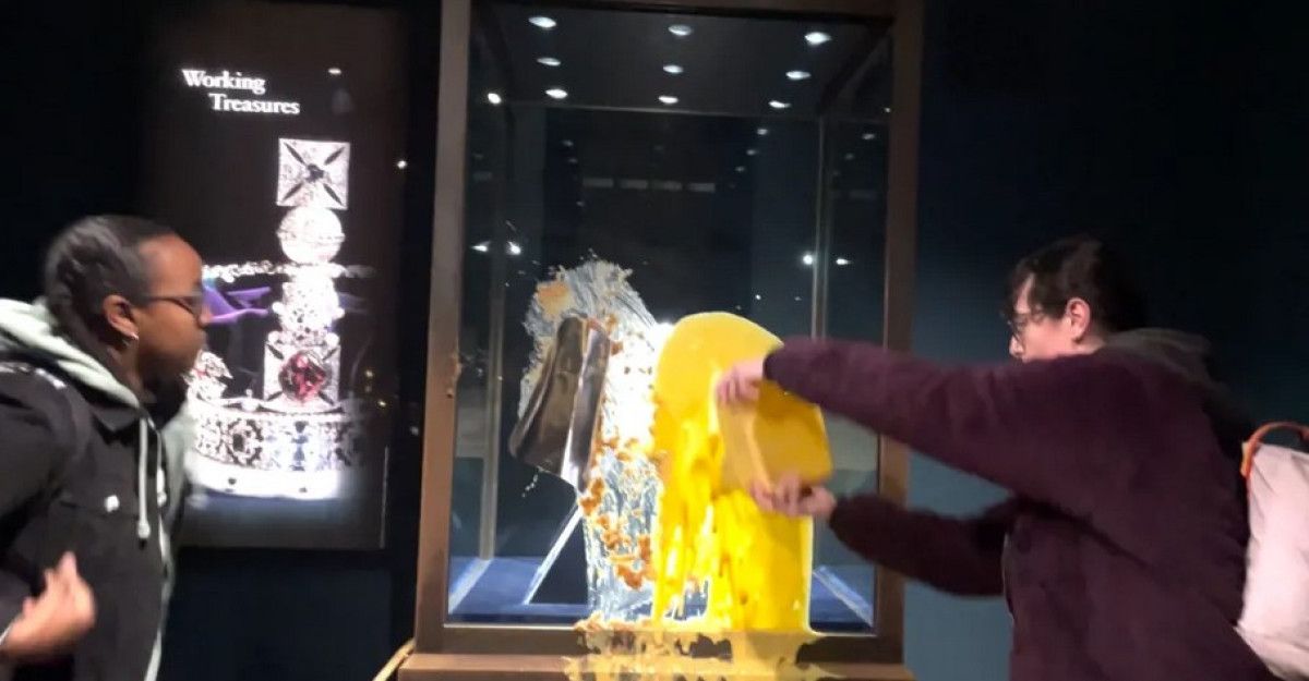 İngiltere’nin başkenti Londra’da bir grup aktivist, kraliyet ailesine ait mücevherlerin sergilendiği Londra Kalesi’nde dikkat çekici bir protestoya imza attı. Yerel saatle 10.00 sıralarında gerçekleşen eylemde “Gücü Geri Al” (Take Back Power) isimli sivil direniş grubu, kraliyet tacını koruyan cam bölmeye muhallebi ve kırıntılı elma tatlısı fırlattı.