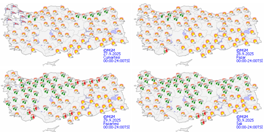 Meteoroloji Genel Müdürlüğü (MGM) tahminlerine göre, yurt genelinde hafta sonunun yağışsız ve serin geçmesi bekleniyor; ancak haftanın ilk günleri yağışlı geçebilir.