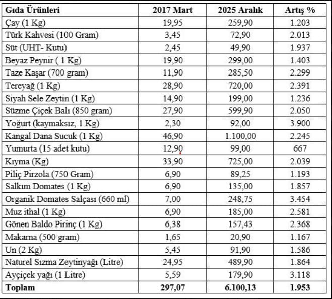 Ekonominin önde gelen isimlerinden Mahfi Eğilmez, son günlerde dikkat çeken bir tabloyu kamuoyuyla paylaştı. Yayınladığı tabloda, 2017’den bu yana Türkiye’de yaşanan enflasyonun vahşi gerçeği net bir şekilde ortaya konuldu. Ekonomik çöküşü gözler önüne seren tabloya göre, birçok ürün binlerce kez zamlandı.