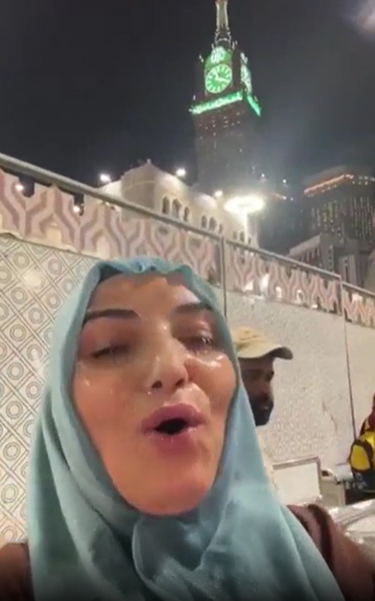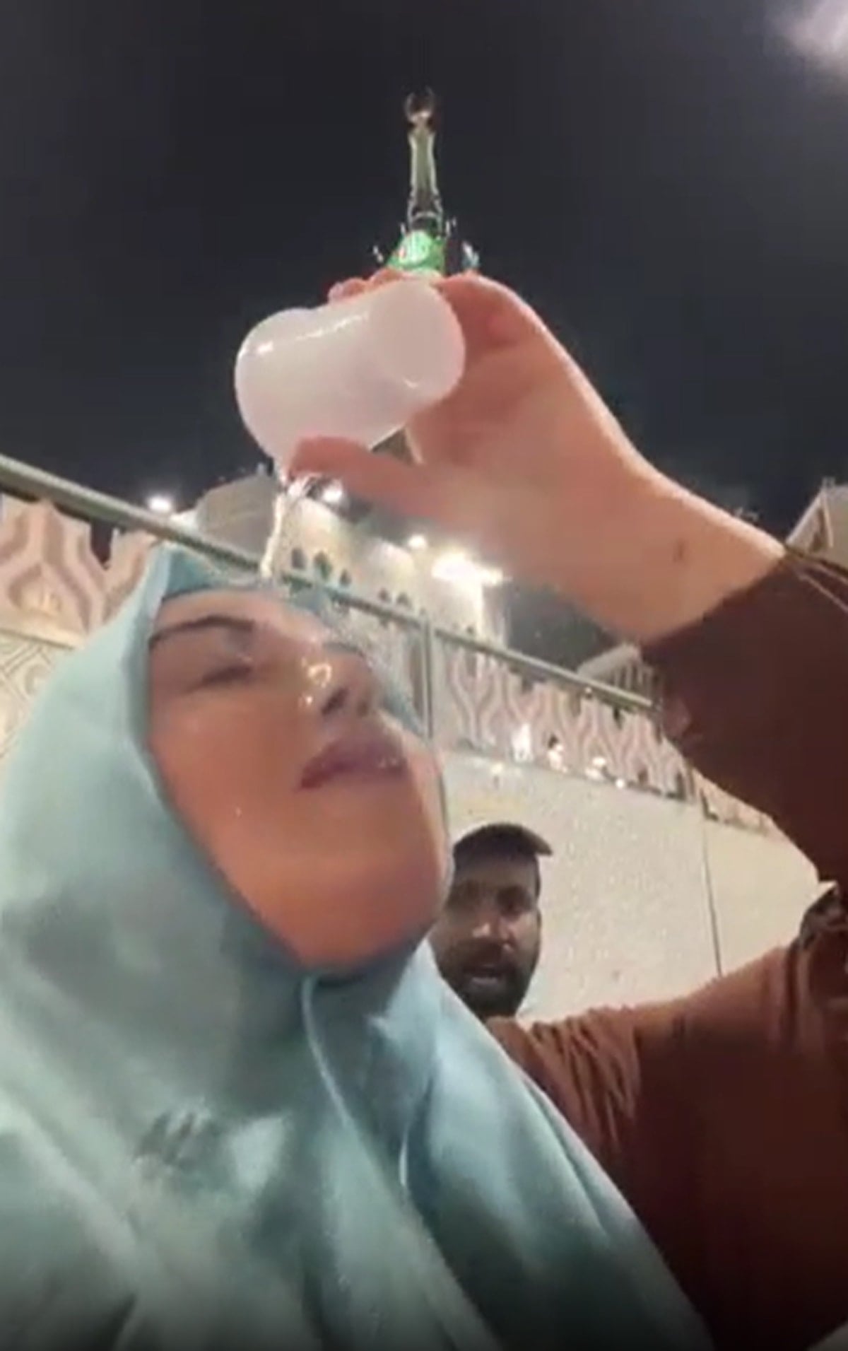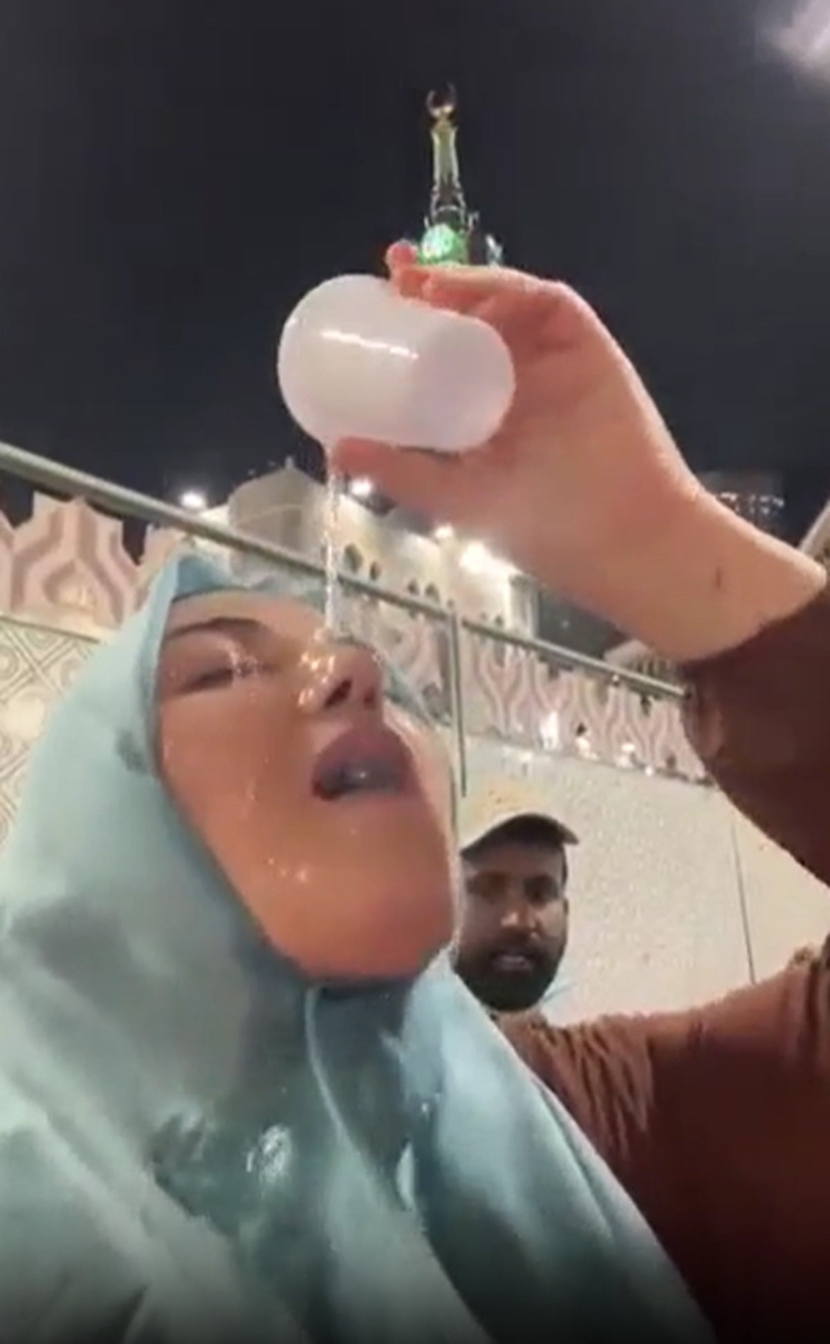 Kutsal topraklarda umre ziyareti sırasında kayda alınan videoda, bir kadının zemzem suyunu yüzüne döktüğü anları cep telefonu kamerasıyla kaydettiği görüldü.